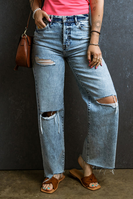 Blue Jeans | Distressed Raw Hem Straight Blue Jeans