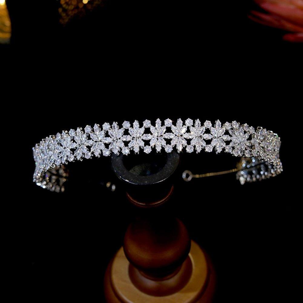 Adorned with shimmering cubic zirconia, this tiara sparkles like a crown of stars, adding a touch of magic to your ensemble. The classic plant pattern design adds a timeless allure, perfect for the modern princess bride. 🌟