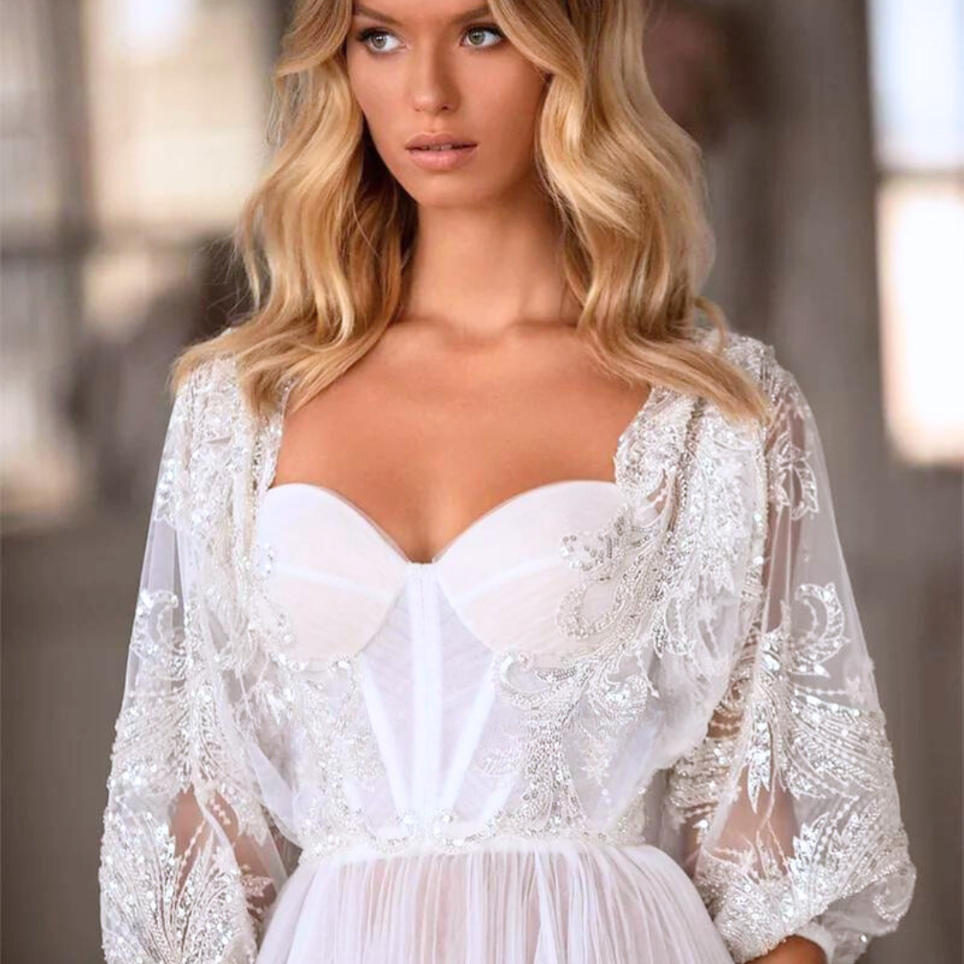 On your magical day, embrace the enchantment of the Long Puff Sleeve Wedding Dress with Sweetheart Neckline. Imagine cascading fabric flowing gracefully as you walk down the aisle, the long puff sleeves adding a touch of whimsical elegance. The classic sweetheart neckline beautifully frames your décolletage, striking the perfect balance between tradition and modern allure.