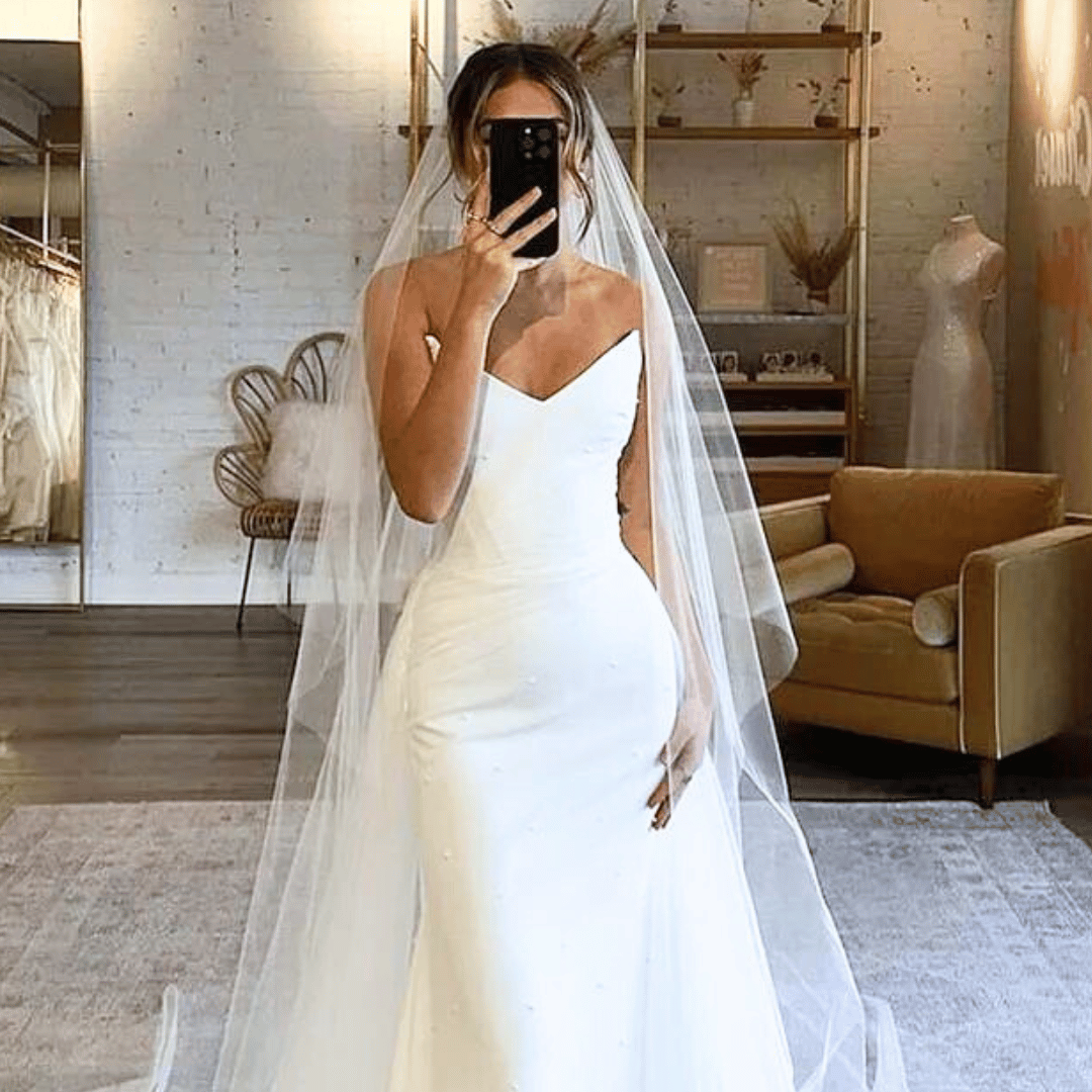Adorned with delicate pearls and intricate beading, this dress sparkles with every movement, capturing the essence of romance and luxury. The mermaid silhouette hugs the curves in all the right places, accentuating your natural waistline before flowing into a floor-length skirt that trails behind you with every step.