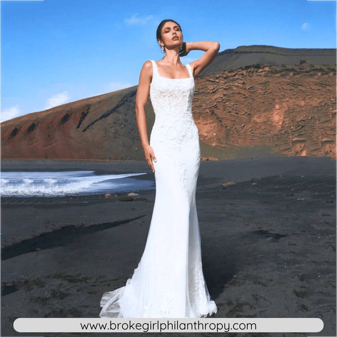 • Embrace your inner boho goddess with the intricate lace appliques and backless design, creating a captivating and ethereal silhouette.