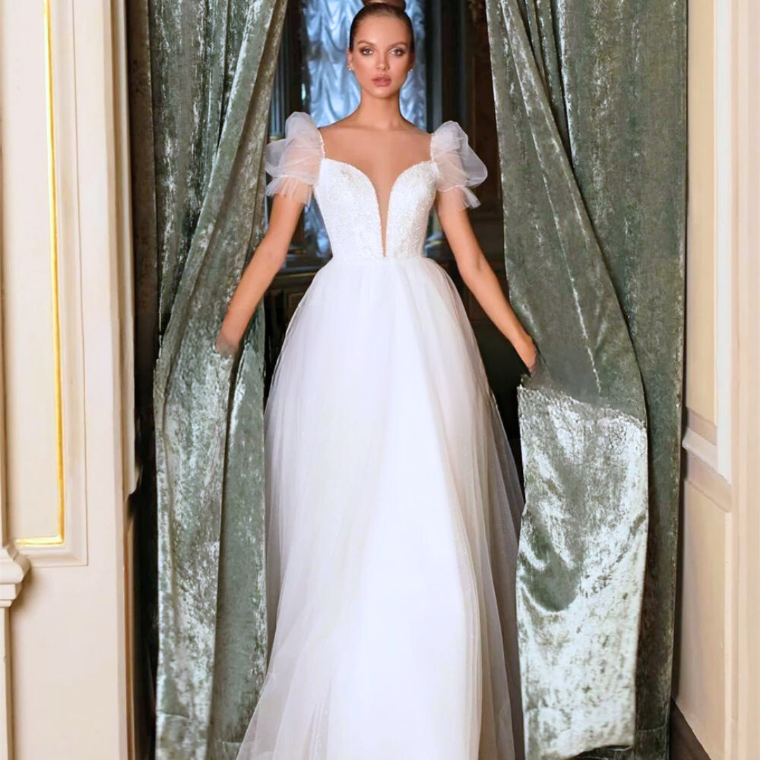 This classic gown features a mesmerizing V-neckline, complemented by captivating short sleeves with delicate embroidery. The luxurious sweep/brush train gracefully flows along the floor-length embroidered organza and tulle fabric, creating an irresistible allure as you walk down the aisle.