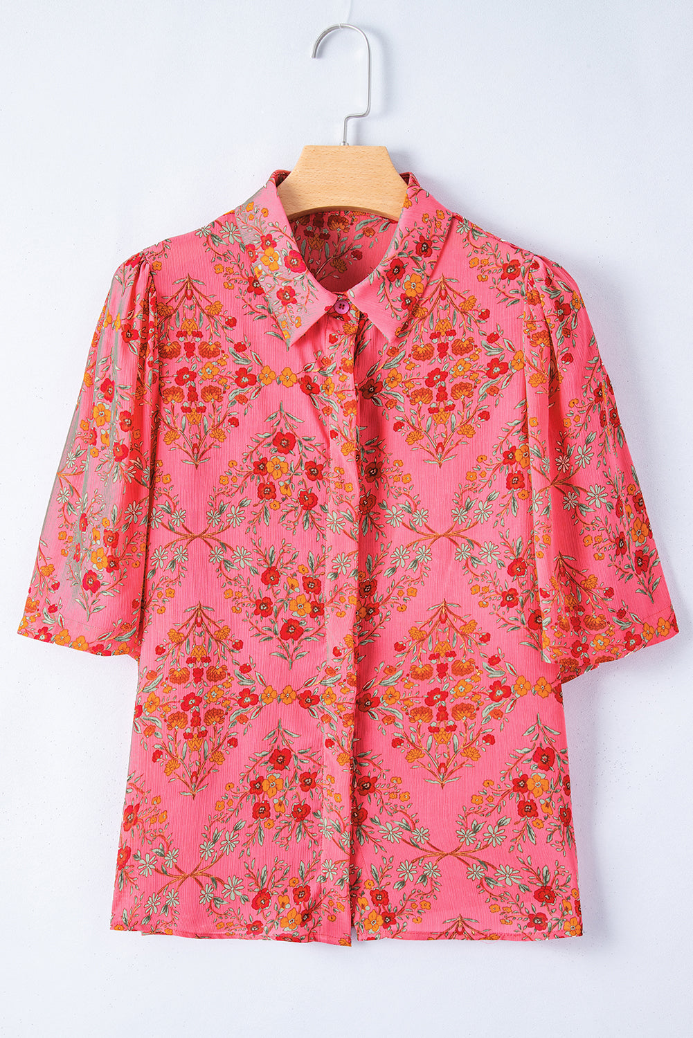 Rose Red Floral Print Wide Short Sleeve Loose Shirt | Tops/Blouses & Shirts