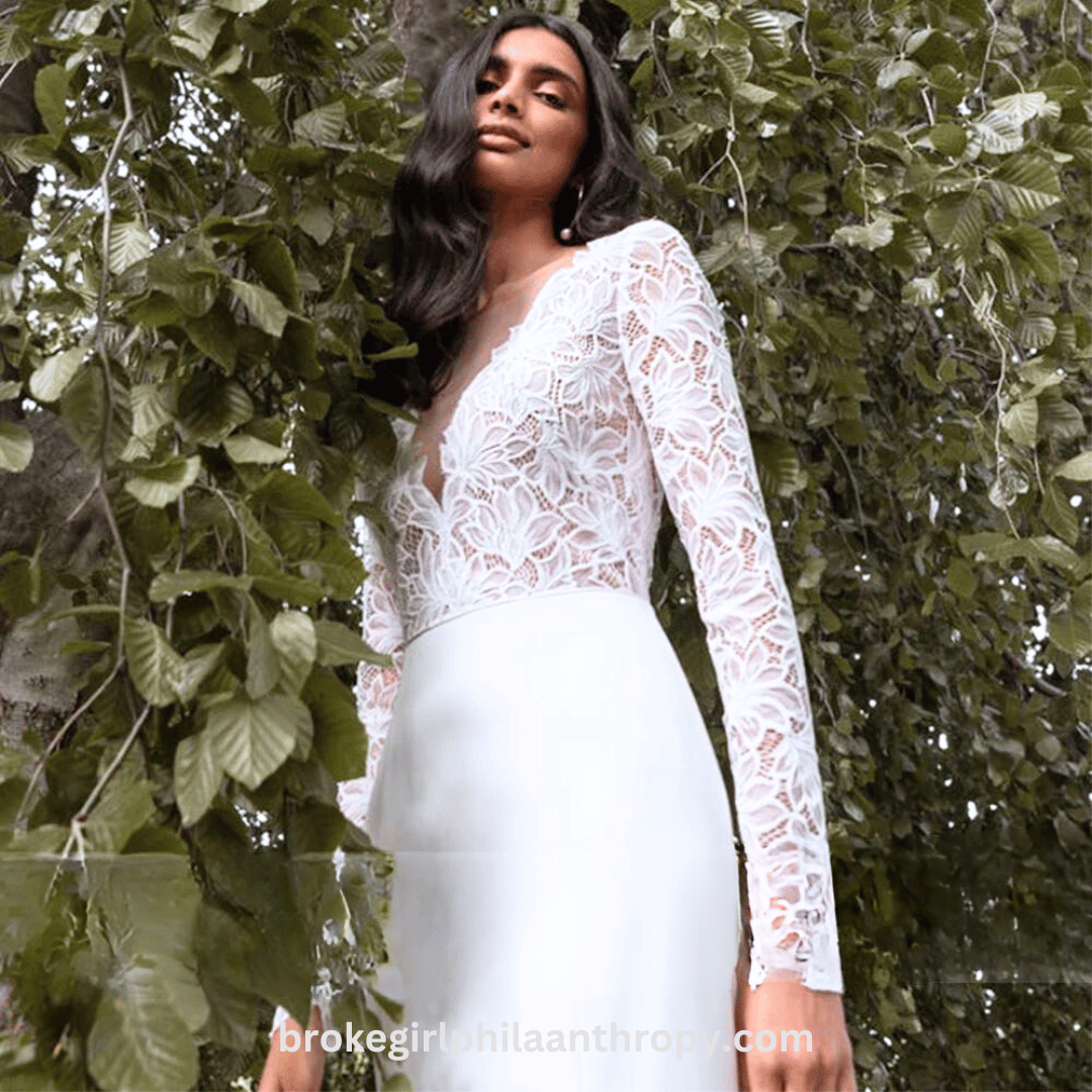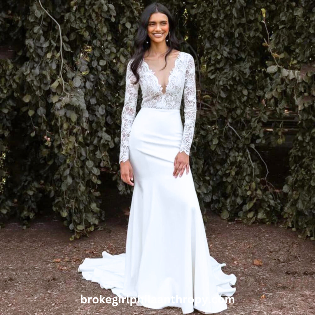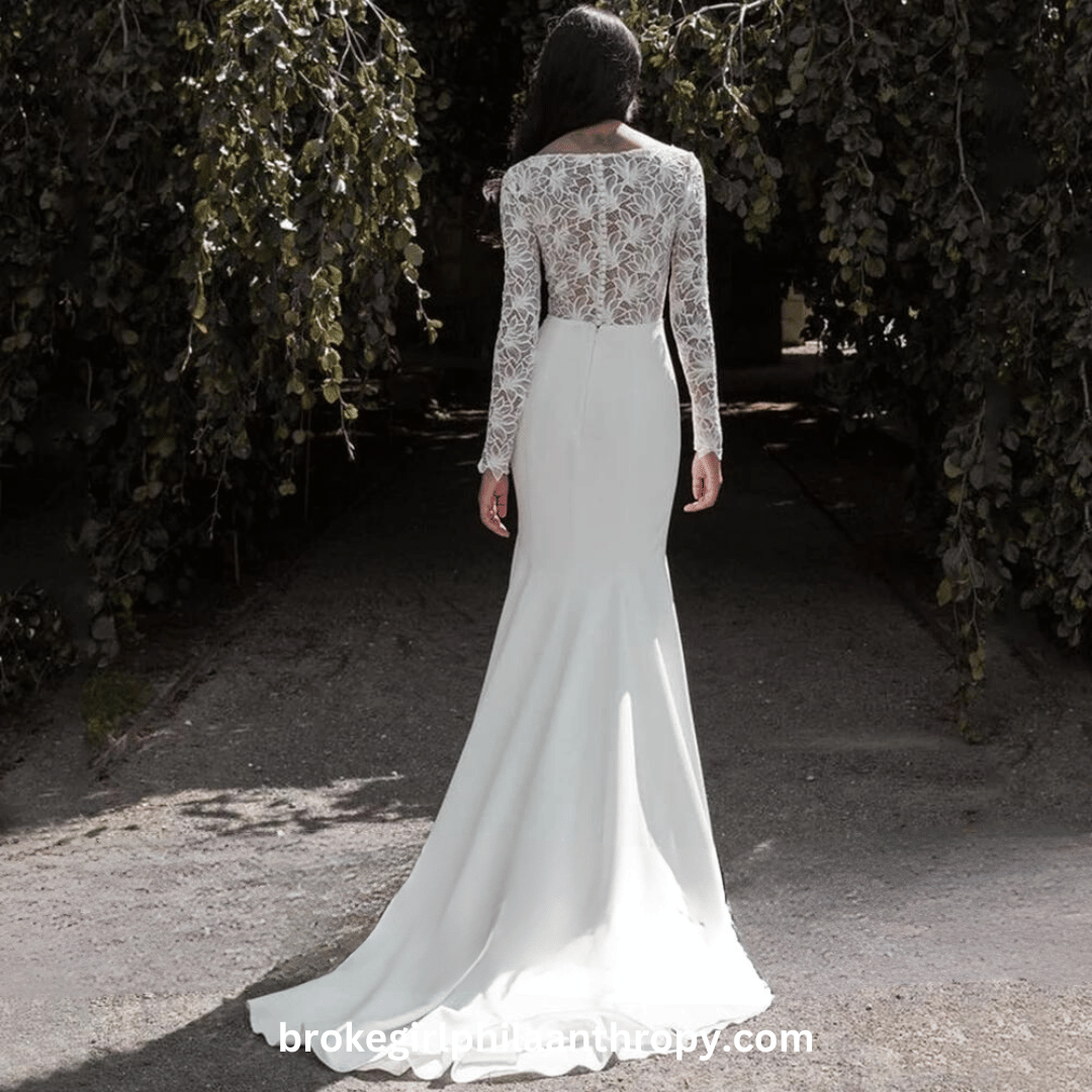 - Embrace timeless elegance on your special day with this Lace and Jersey Mermaid Wedding Dress, featuring a romantic scoop neckline and illusion long sleeves to enchant your guests.
