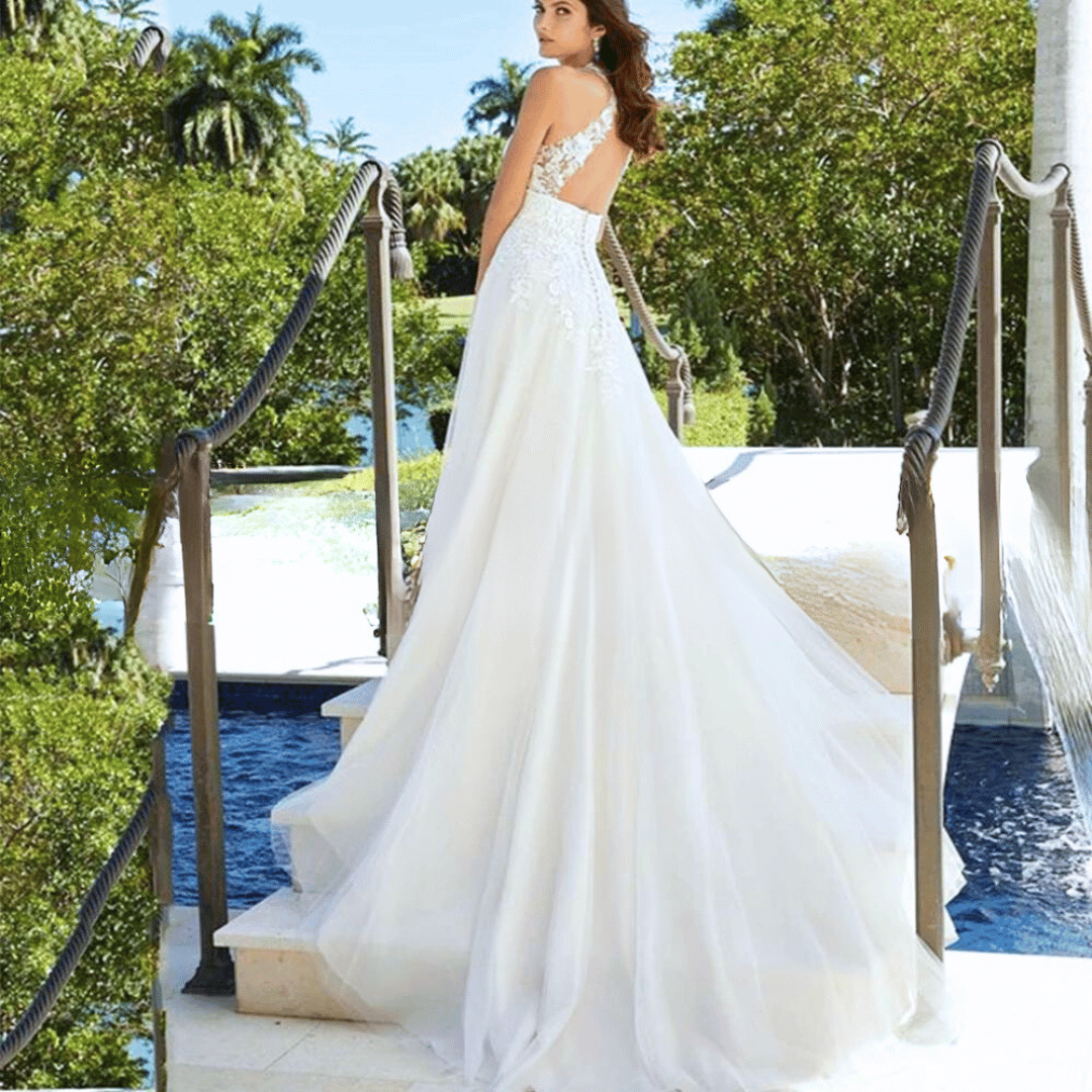 Step into a world of timeless romance and elegance with our exquisite White Wedding Sexy Wedding Dress | Halter Backless Tulle Lace A-Line with Chapel Train.