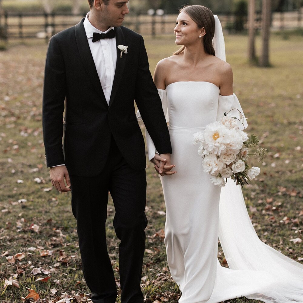 Introducing our enchanting Detachable Long Sleeves Strapless Sheath Wedding Dress! This whimsical gown effortlessly combines simplicity and elegance, making it the perfect choice for your special day.