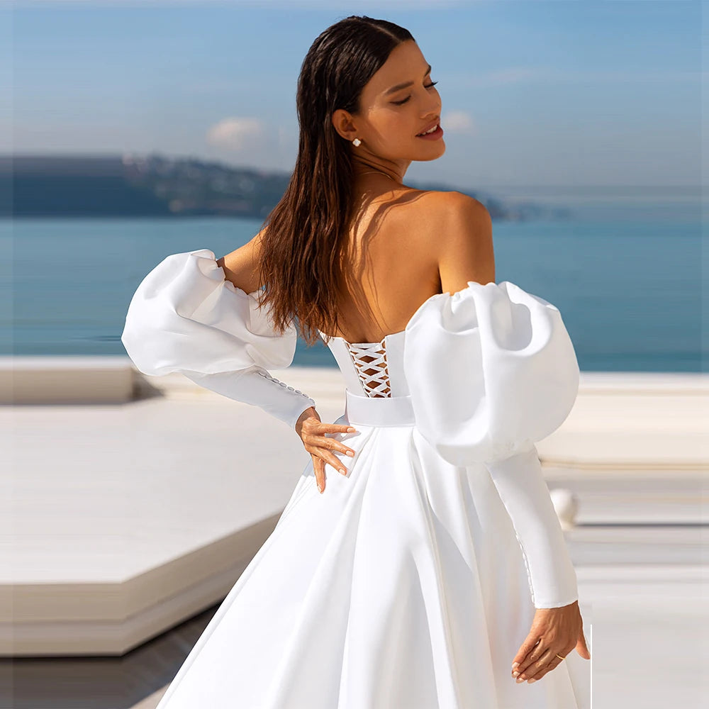 Indulge in the allure of a simple satin strapless beach wedding dress with detachable lantern sleeves. Let your love story unfold in this enchanting gown that will make you feel like the most beautiful bride in the world.