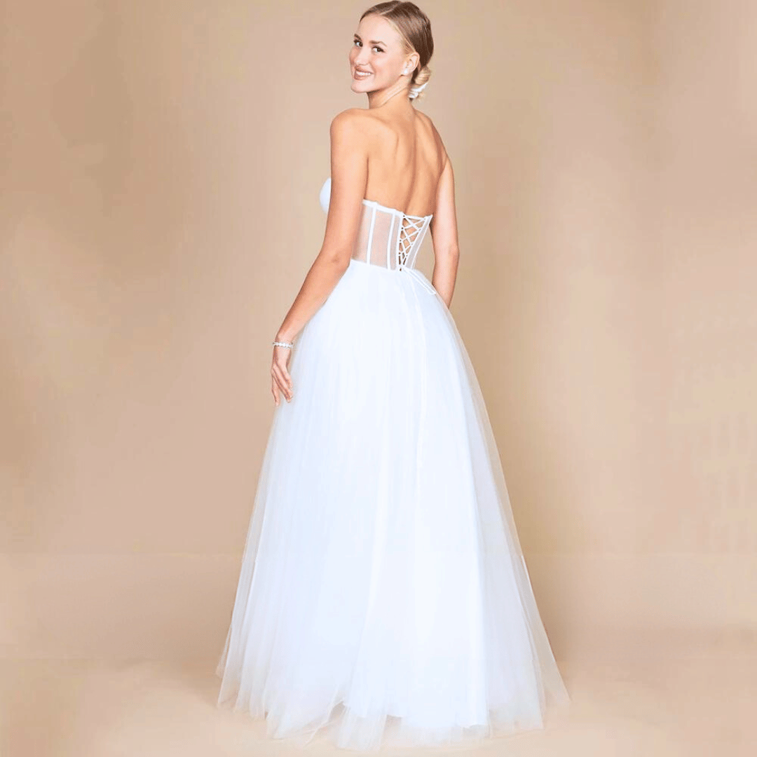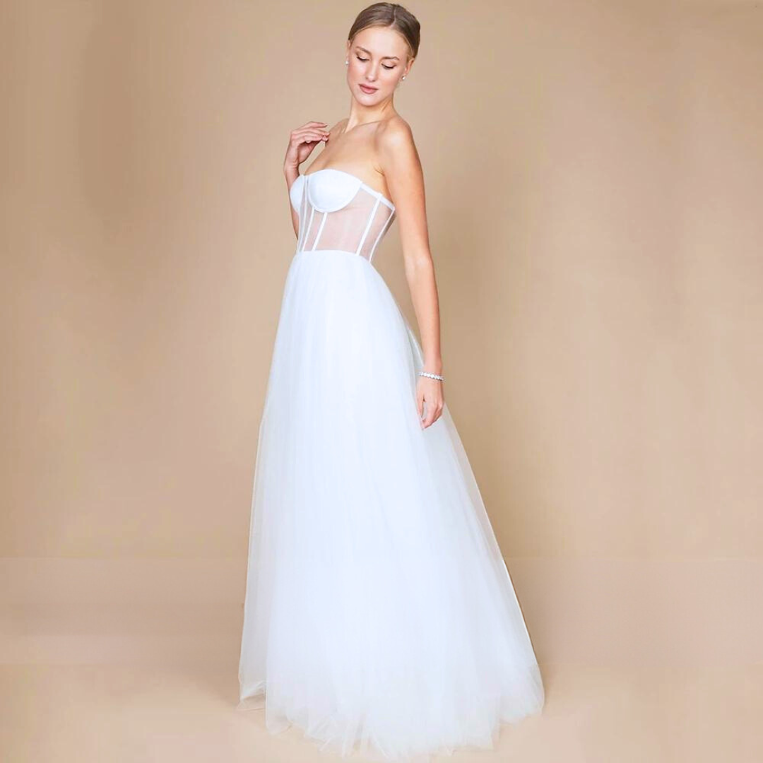 Step into a world of timeless elegance and grace with our Simple Strapless Sleeveless A Line Tulle Beach Wedding Dress.