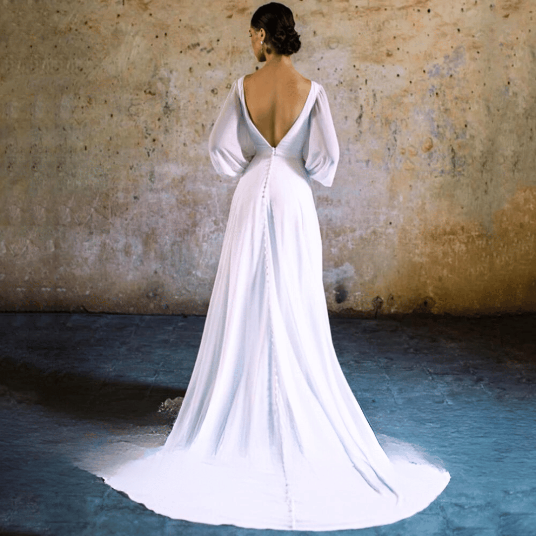 Capture hearts and create everlasting memories as you walk down the aisle in our Simple V-Neck Lantern Long Sleeve Wedding Dress. Embrace the magic of your wedding day in a gown that embodies romance and sophistication.