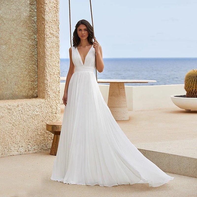 Introducing our exquisite Beach Wedding Dress-V Neck Chiffon Bridal Gown-Elegant Deep V-neck Chiffon Beach Wedding Dress, the epitome of romance and elegance. This captivating gown is designed to make you feel like a true goddess on your special day.
