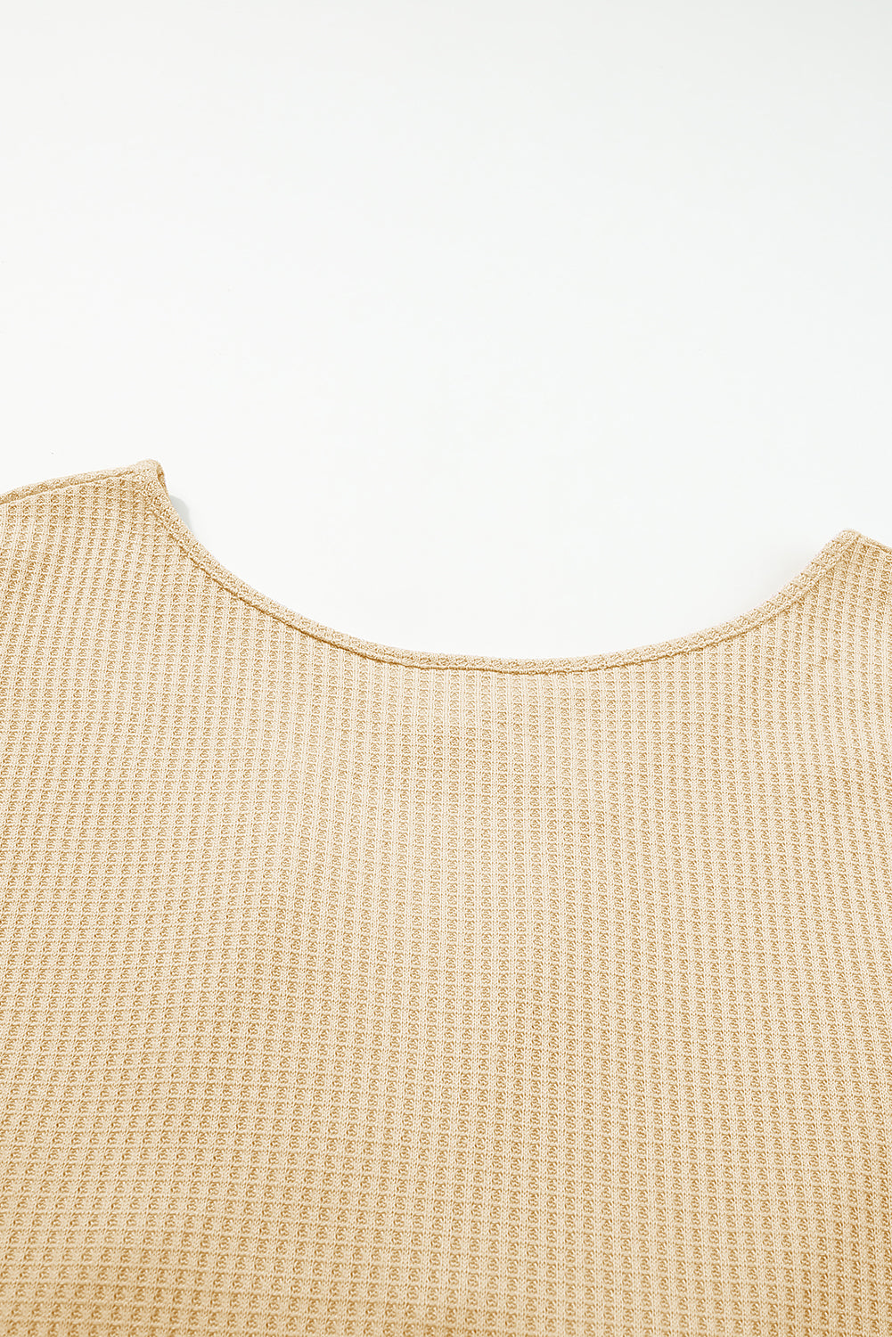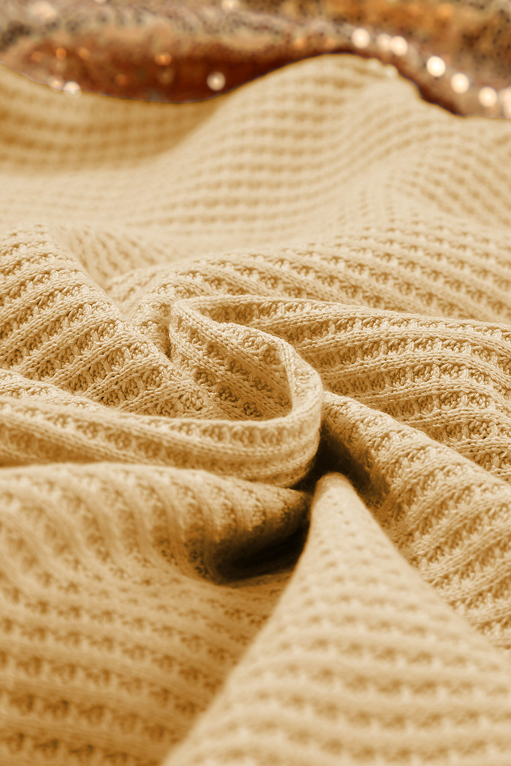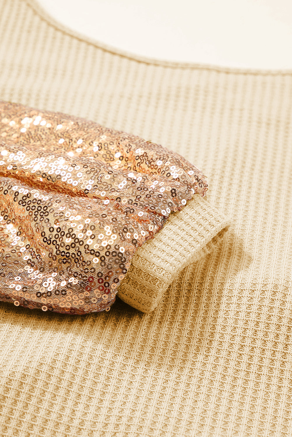 Waffle Knit Top | Apricot Sequin Patchwork Sleeve Open Back