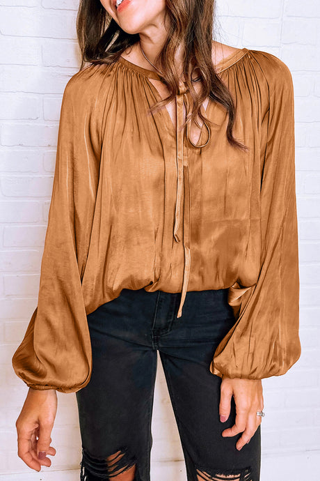 Camel Satin Pleated Tied V Neck Puff Sleeve Blouse