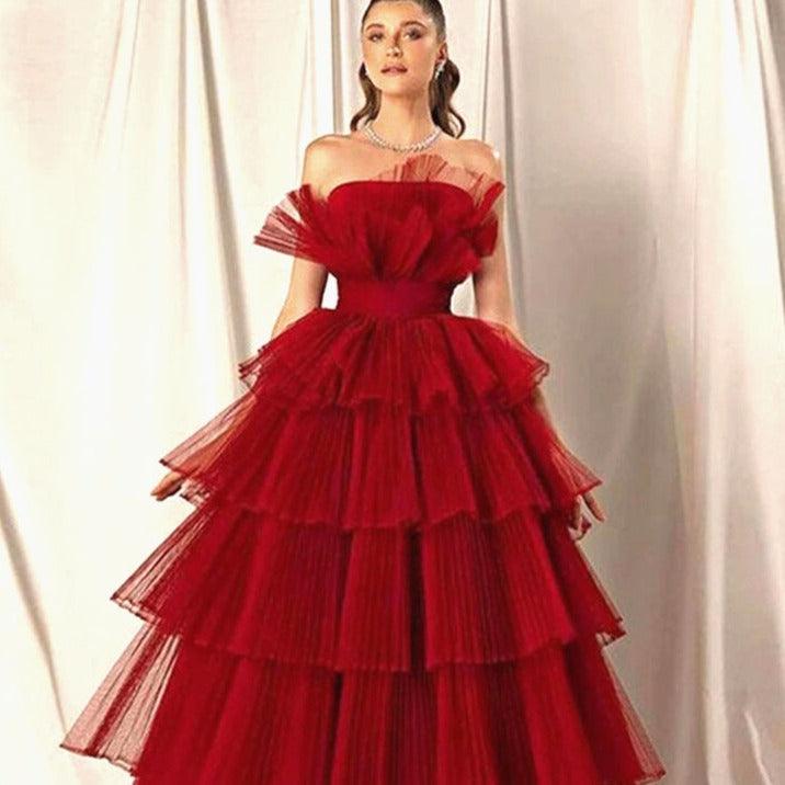 Enjoy the grandeur of a night in a royal palace with this luxurious Wine Burgundy A Line Princess Strapless Formal Evening Party Dress.