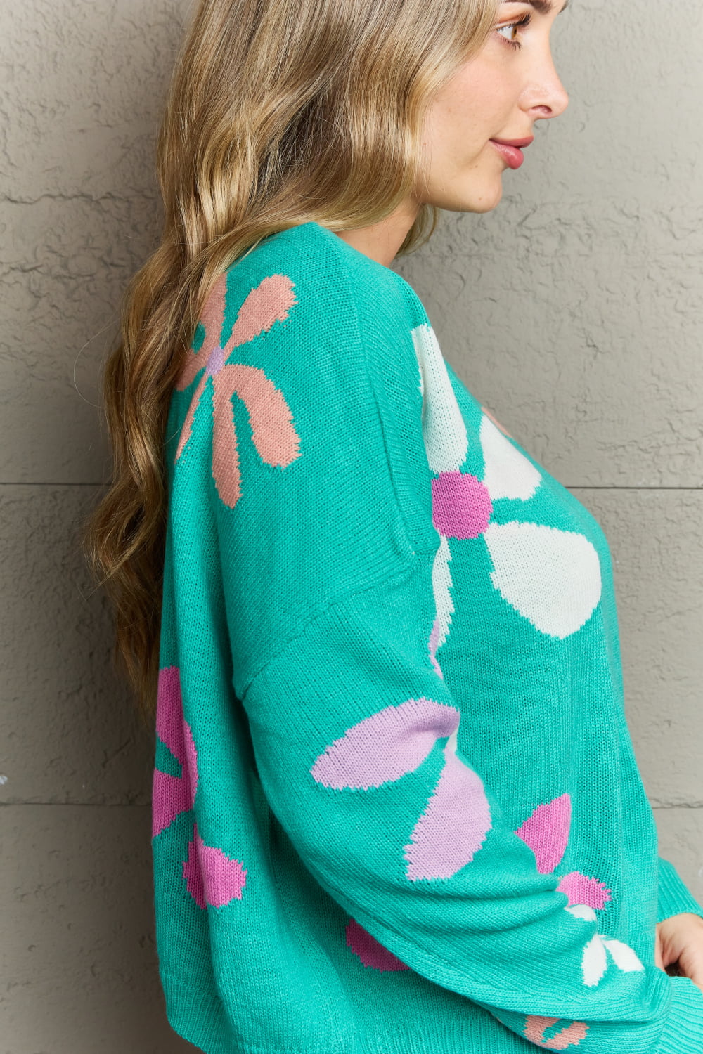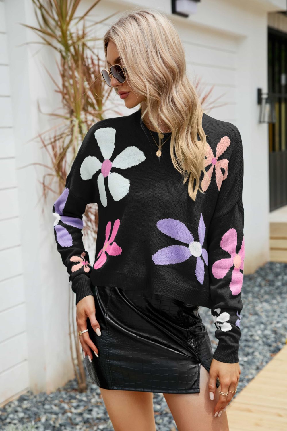 • Womens Sweater-Floral Dropped Shoulder Ribbed Trim Sweater