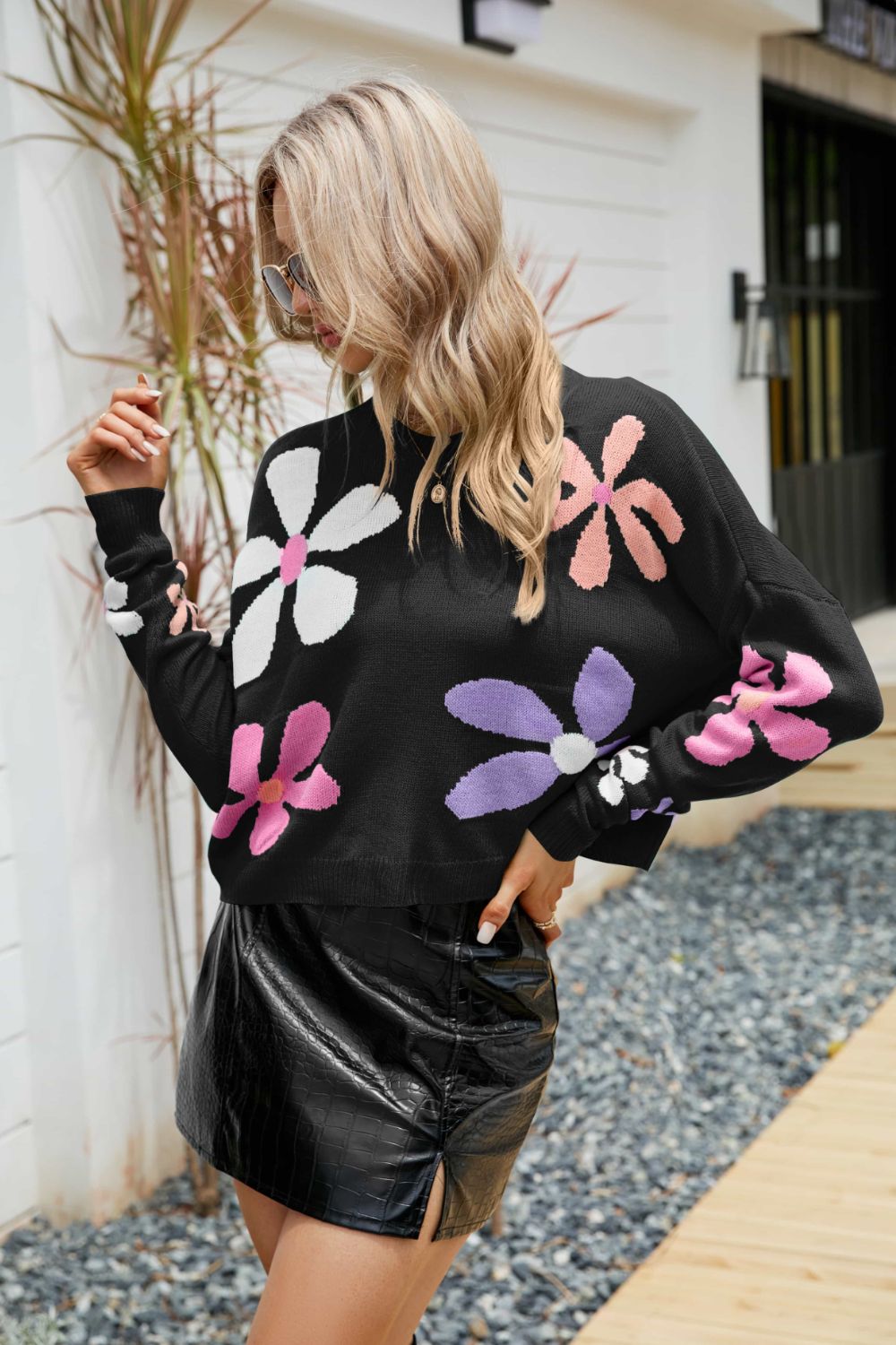 Womens Sweater-Floral Dropped Shoulder Ribbed Trim Sweater