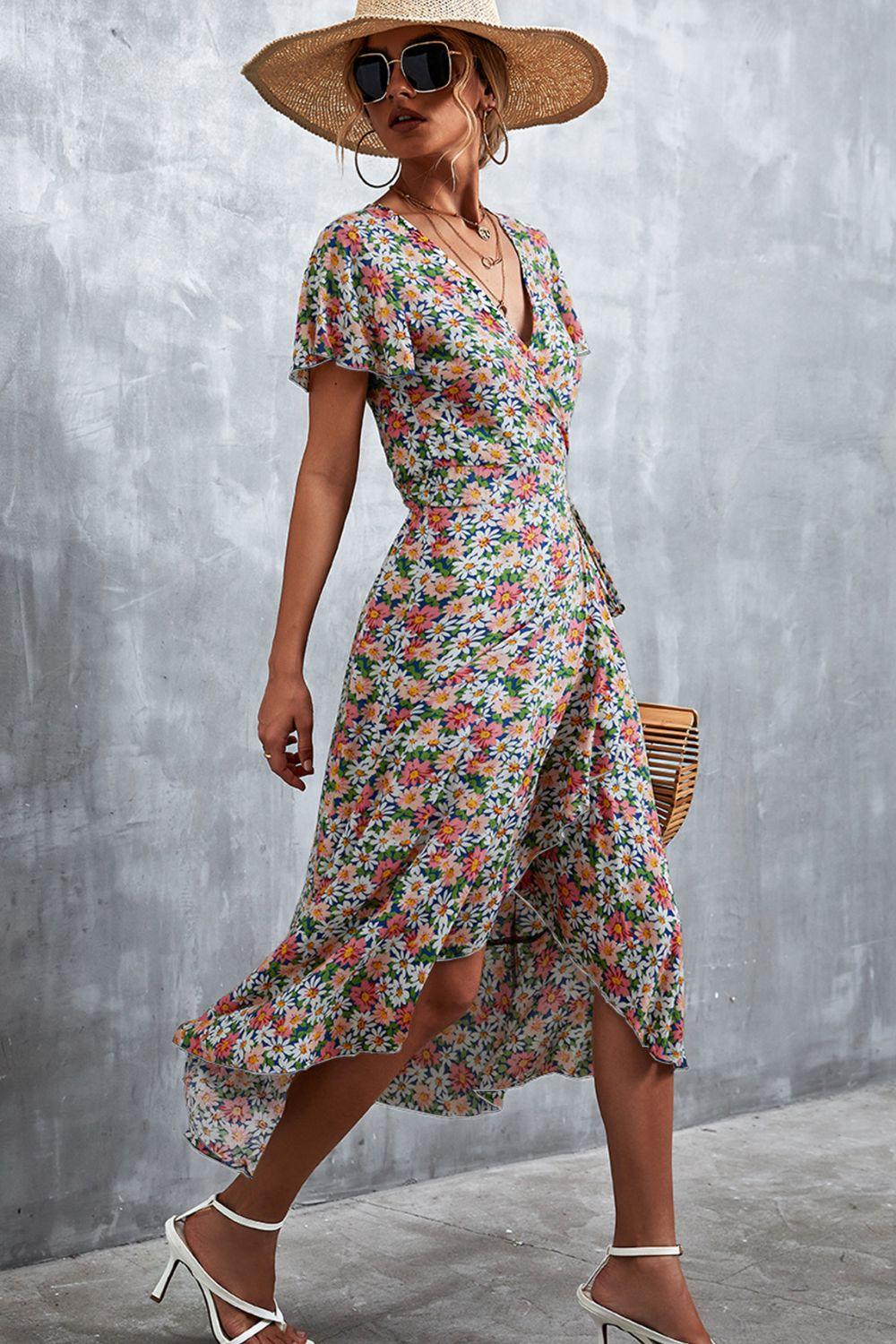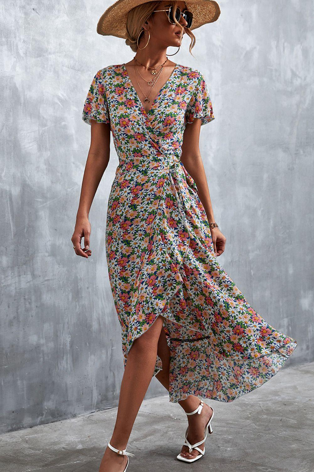 This Floral Surplice Neck Tied Midi Dress from Broke Girl Philanthropy is perfect for any occasion.