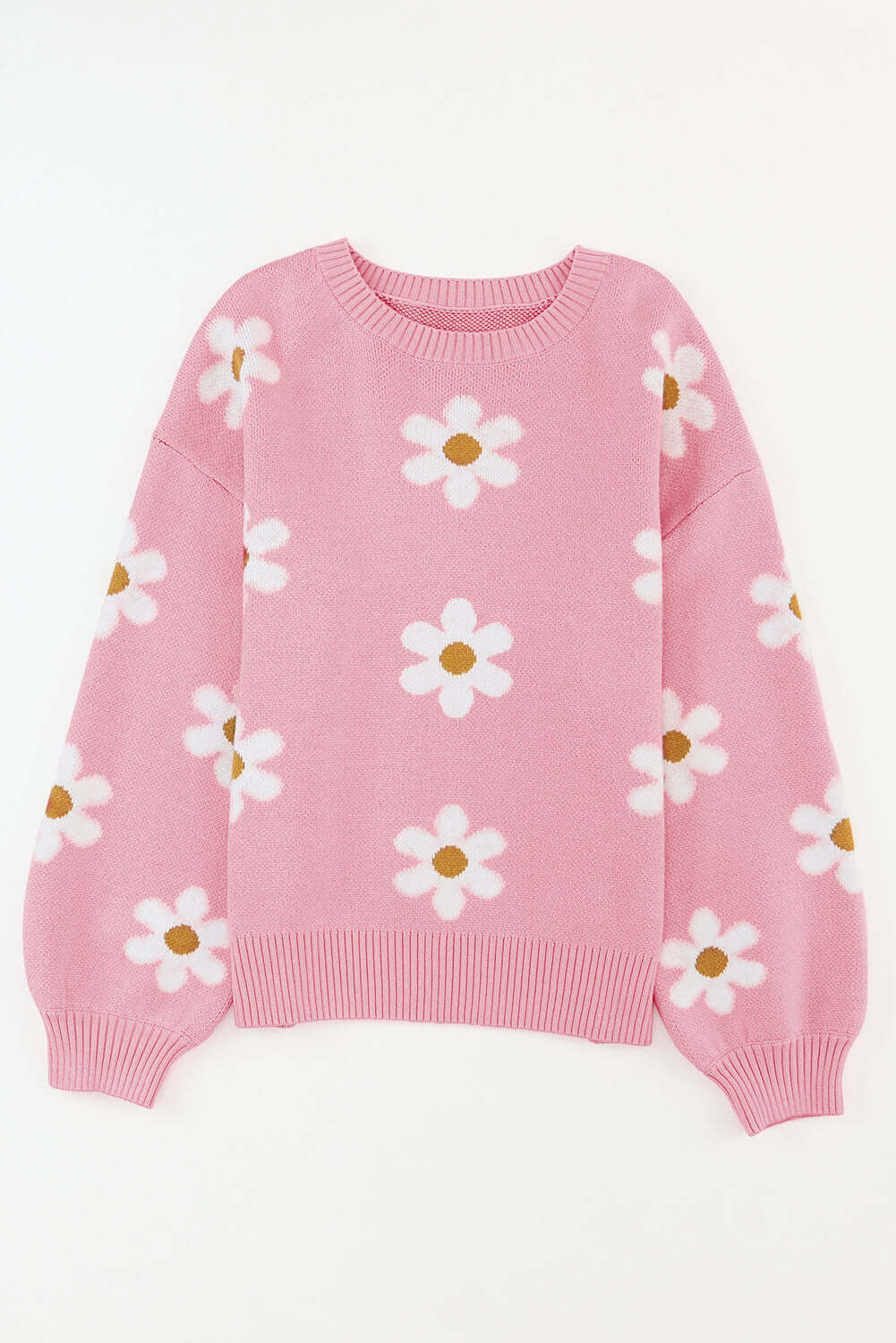 Pink flower sweater with round neck and dropped shoulders, designed for women's winter clothes, featuring a playful floral pattern.
