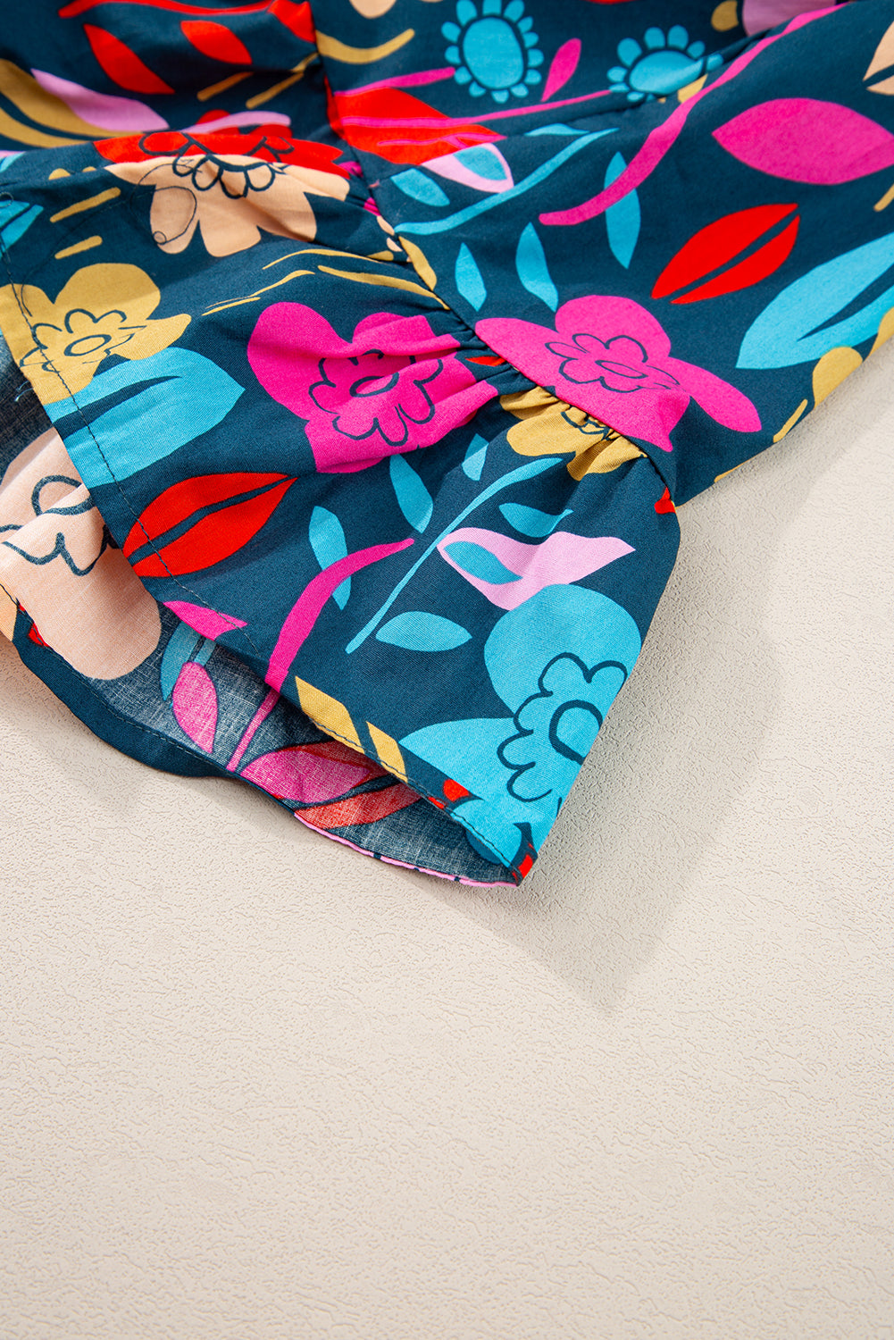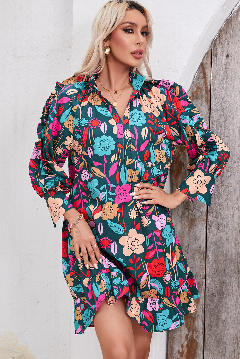 Green Floral Print Puff Sleeve Ruffled Mini Dress