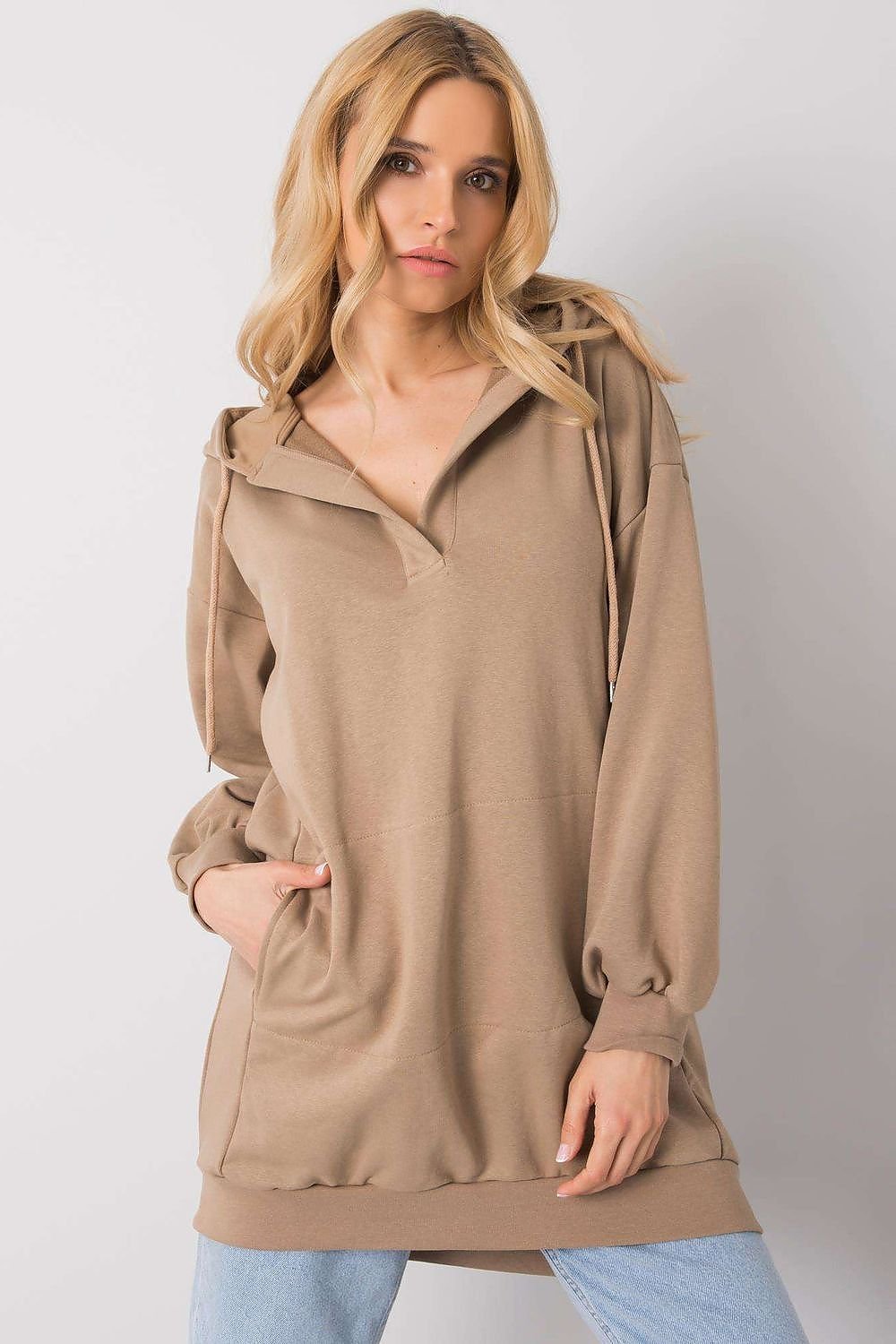 Women's sweatshirt of an extended cut with a hood. On the front a kangaroo type pocket. Ideal proposal for everyday and not only.