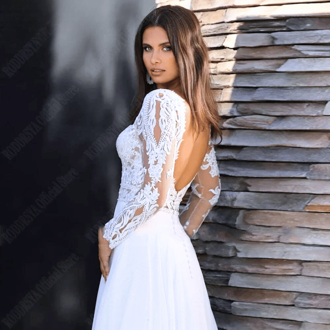 Designed for the free-spirited bride, this enchanting gown boasts intricate lace appliques and a flowing A-Line silhouette that will make you feel like a bohemian goddess on your special day. The V-Neckline adds a touch of allure, while the long sleeves provide a romantic feel.