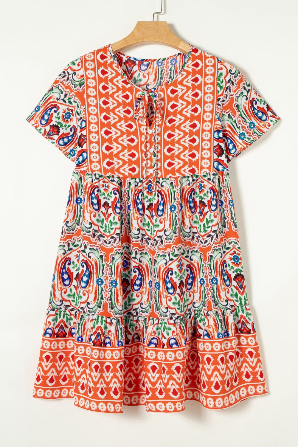 Womens Short Sleeve Dress-Printed Tie Neck Short Sleeve Dress