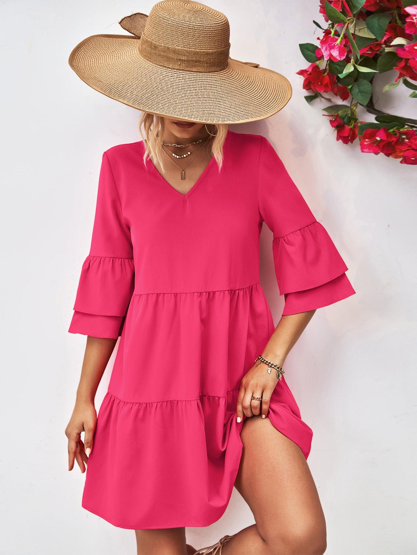Womens Mini Dress-V-Neck Flare Sleeve Mini Dress | Dress