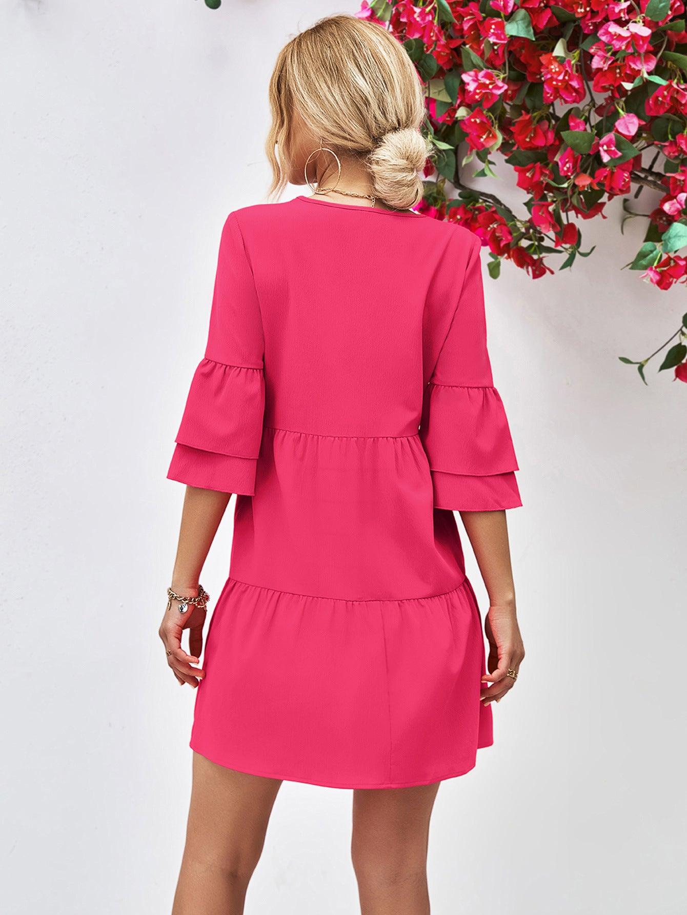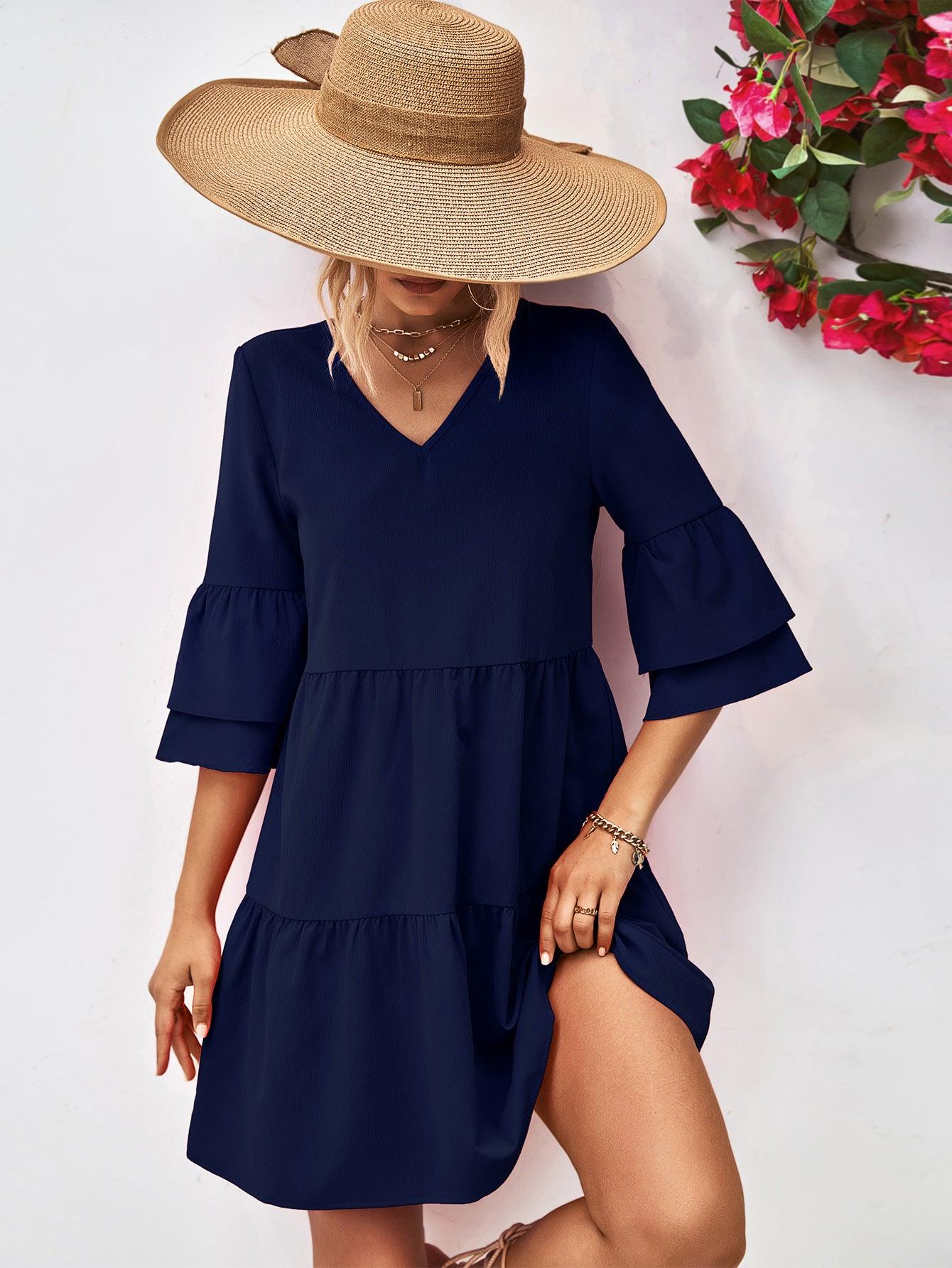 Indulge in the exquisite charm of the Womens Mini Dress-V-Neck Flare Sleeve Mini Dress. Embrace elegance and grace with its ruffle neckline and flowing flare sleeves. This dress is not just a garment; it is a declaration of style and sophistication.