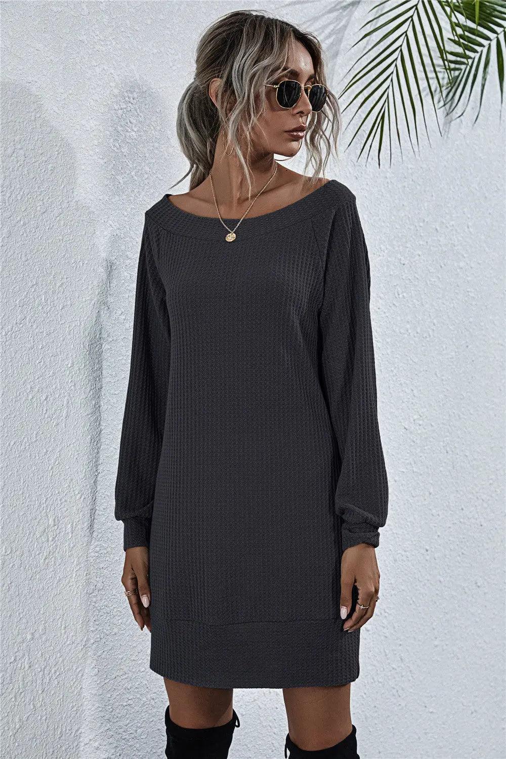 Womens Mini Dress-Waffle-Knit Boat Neck Mini Dress | Dresses