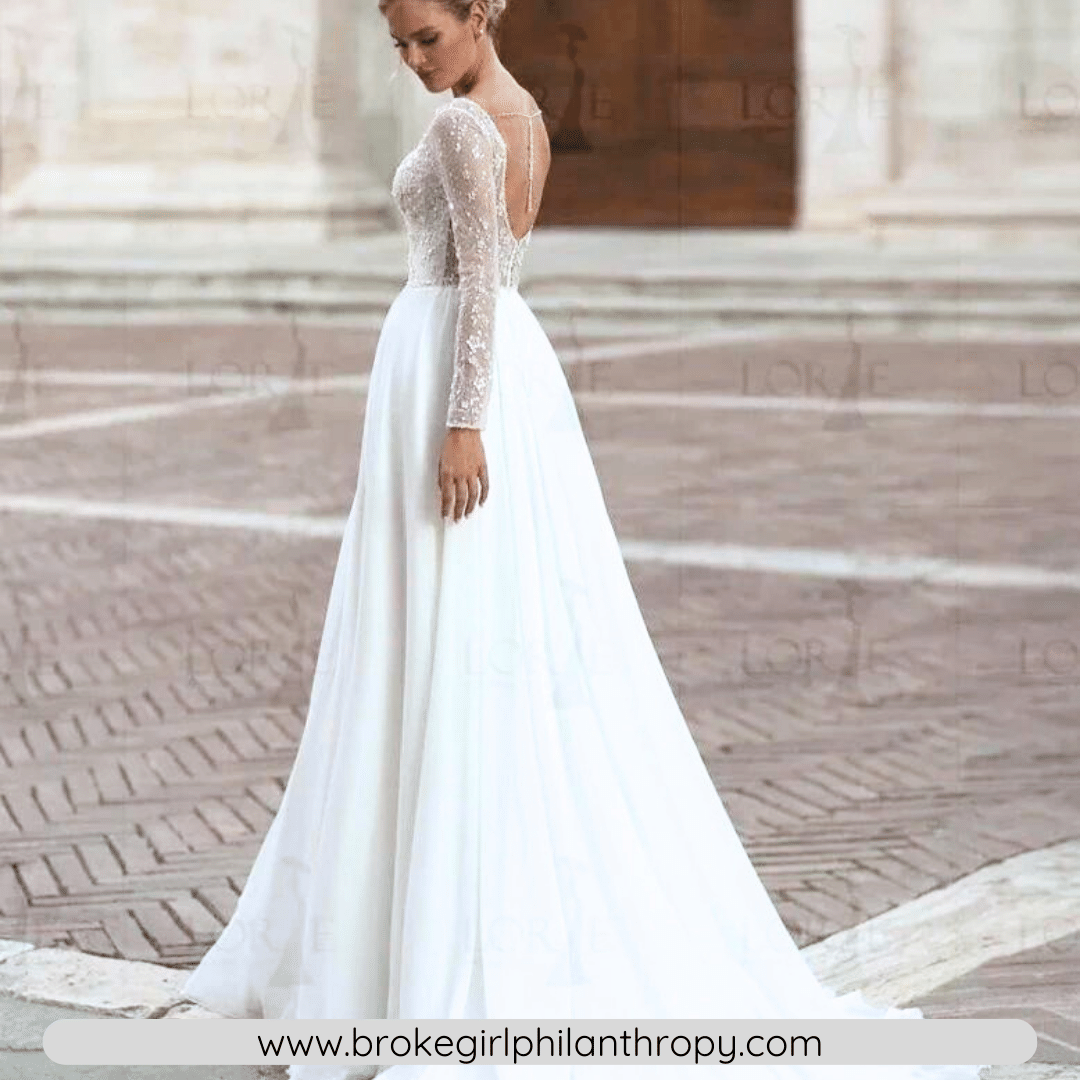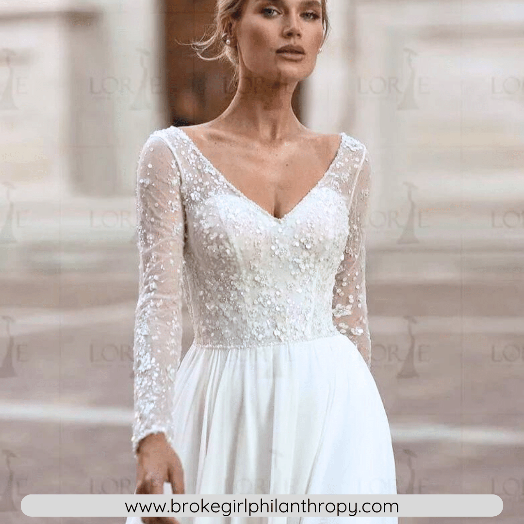 With its delicate V-neckline and full-length sleeves, this dress exudes a sense of timeless charm. The A-line silhouette gracefully flows down to the floor, creating a mesmerizing effect as you walk down the aisle. Crafted from a combination of chiffon and satin, the dress drapes beautifully, adding a touch of ethereal allure to your bridal look.