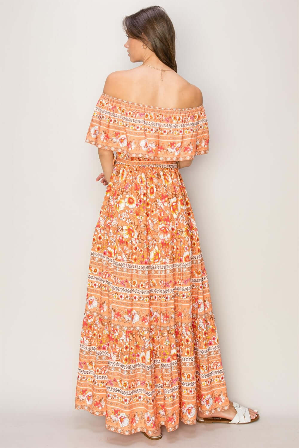 The floral print adds a playful and feminine touch to the overall design. The maxi length of the dress is perfect for formal events or summer soirees. Made from high-quality and flowy fabric, this dress ensures both comfort and style. Make a statement in this gorgeous floral off-shoulder maxi dress and turn heads wherever you go!