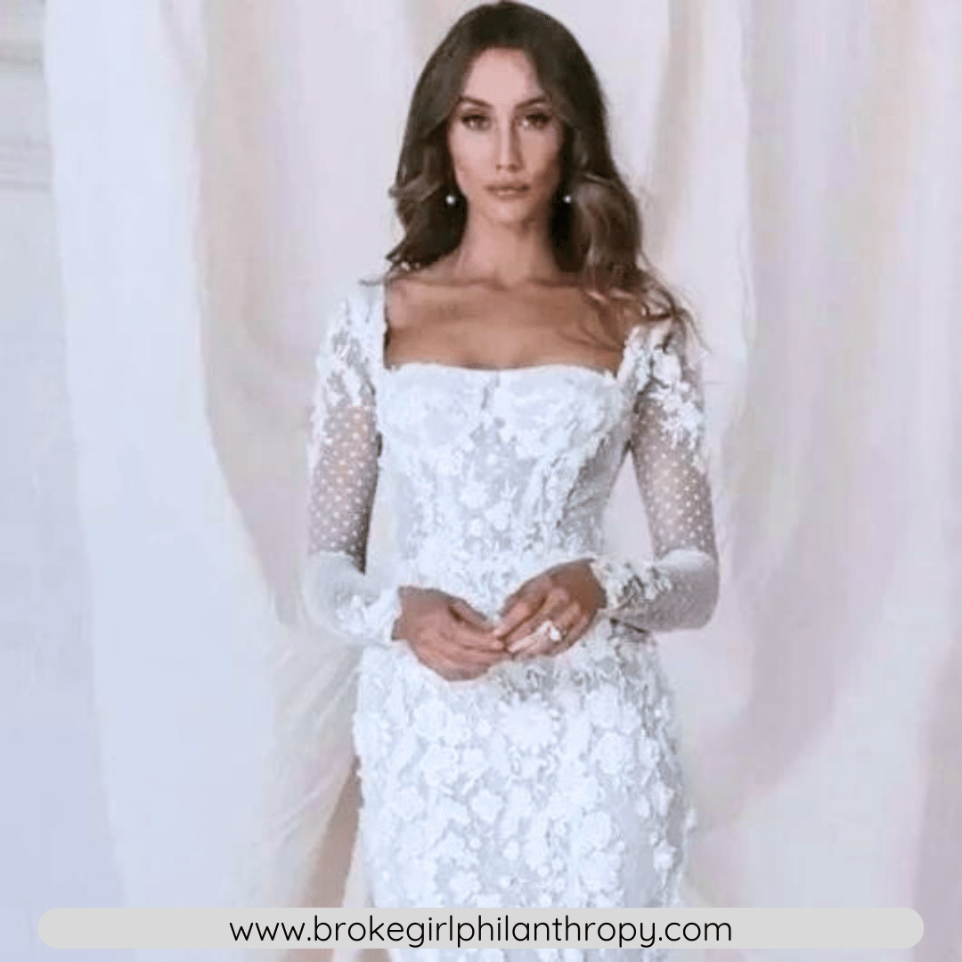 Crafted with love and attention to detail, this gown features a sweetheart neckline that beautifully accentuates your curves. The long sleeves, adorned with delicate lace appliques and flowers, add a touch of elegance and femininity. The backless design, enhanced by a row of buttons, creates a mesmerizing focal point that will leave your guests in awe as you make your way down the aisle.