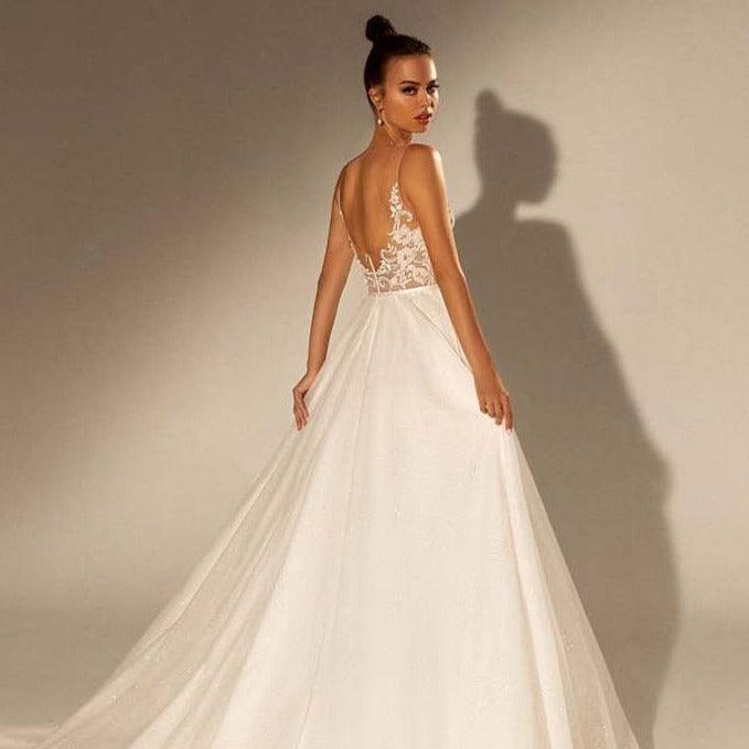 This Elegant Sleeveless Backless A-Line Beach Wedding Dress is designed to be comfortable and lightweight. It features a natural waistline, court train, and classic sleeve style.