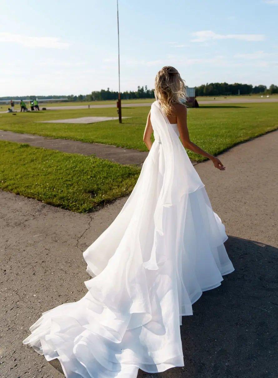 • Organza and Tulle Fabric: Crafted from a combination of organza and tulle, this dress is both lightweight and breathable, perfect for a beach wedding.