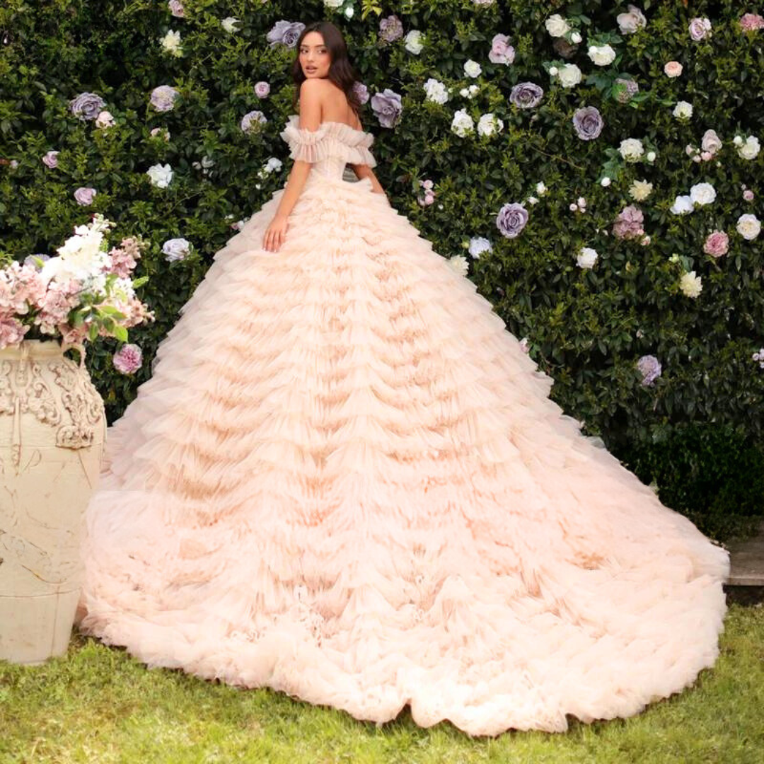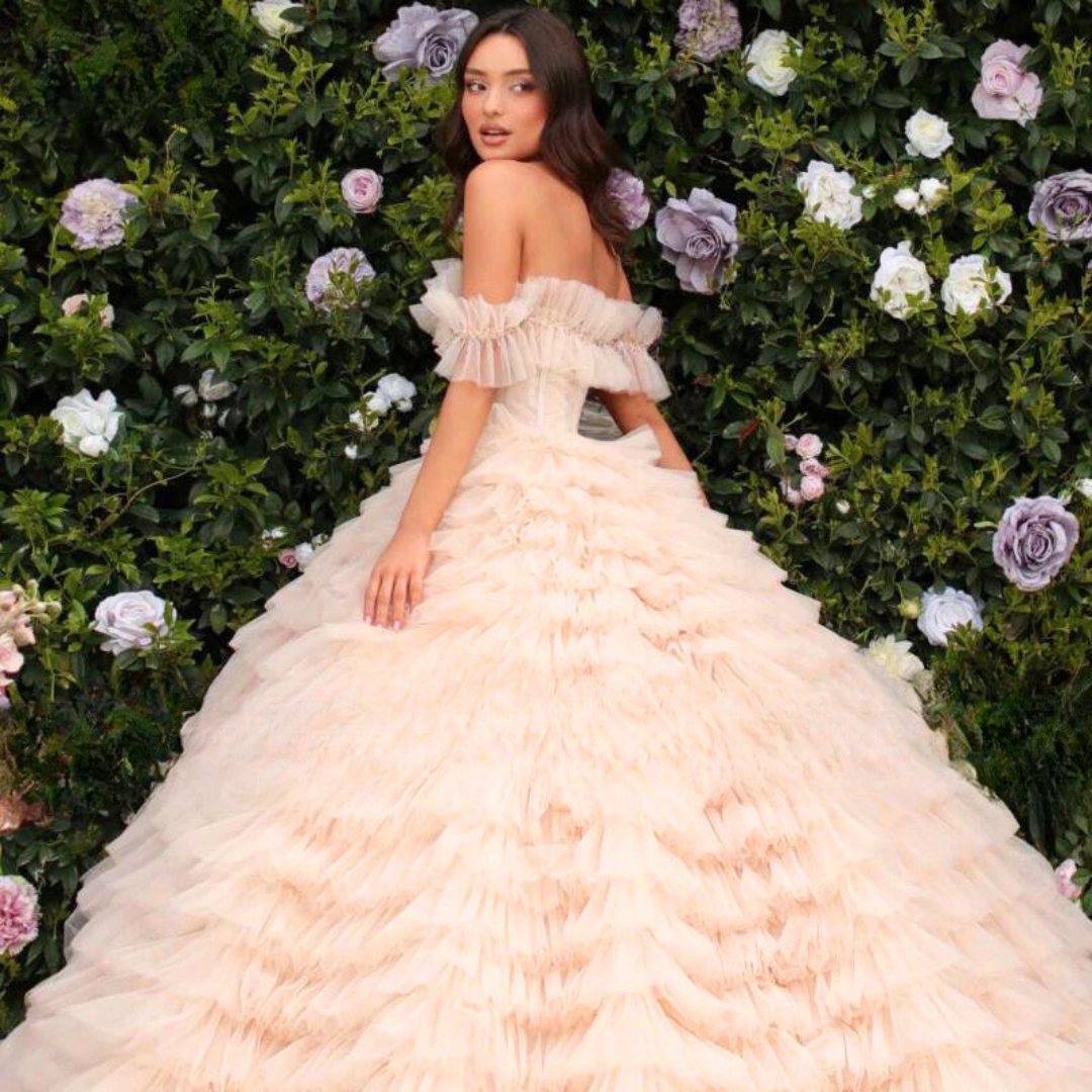 Crafted with intricate beading, tiered layers, and precise pleats, this dress boasts an off-the-shoulder sleeve style that frames your radiance like sunlight through cobweb lace. With whispers among couture circles suggesting that nine out of ten woodland nymphs prefer our stunning Ball Gown silhouette for their midsummer festivities (an entirely made-up statistic to dazzle you), it's clear this is more than just attire—it’s wearable magic.