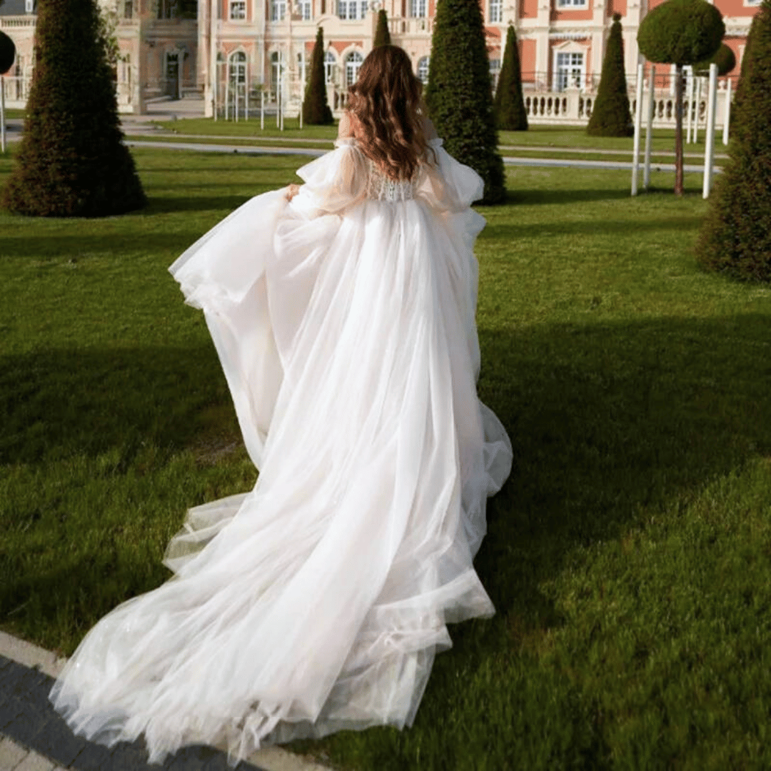 Imagine yourself walking down the aisle in this enchanting dress, with long puff sleeves adding a whimsical flair to your bridal look. Whether you're saying "I do" at a boho beach wedding or a glamorous evening affair, this gown will make you feel like royalty.