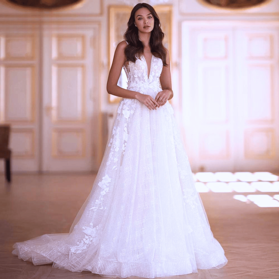 The A-line silhouette of this bridal gown is universally flattering, accentuating your natural waistline and flowing effortlessly down to the floor. The lace appliques, delicate beading, and intricate floral details add a romantic and vintage-inspired charm to the dress, making it truly one-of-a-kind.