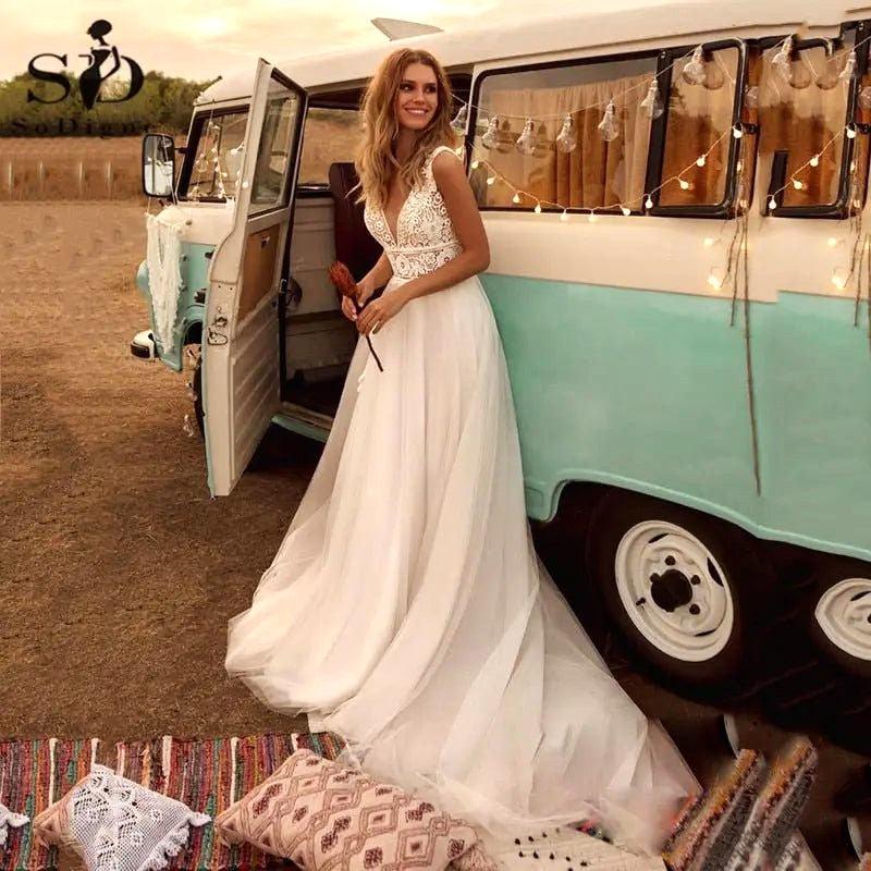 Look stunning on your special day with this Bohemian V Neck Lace Beach Vintage Bridal Gown!