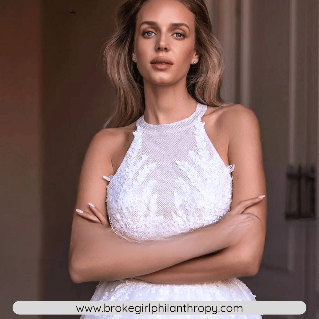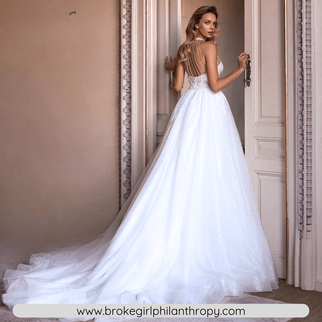 Crafted from luxurious lace, this gown exudes a sense of old-world charm and is sure to leave your guests in awe. The backless design adds a hint of allure, allowing you to showcase your graceful posture and radiant confidence.
